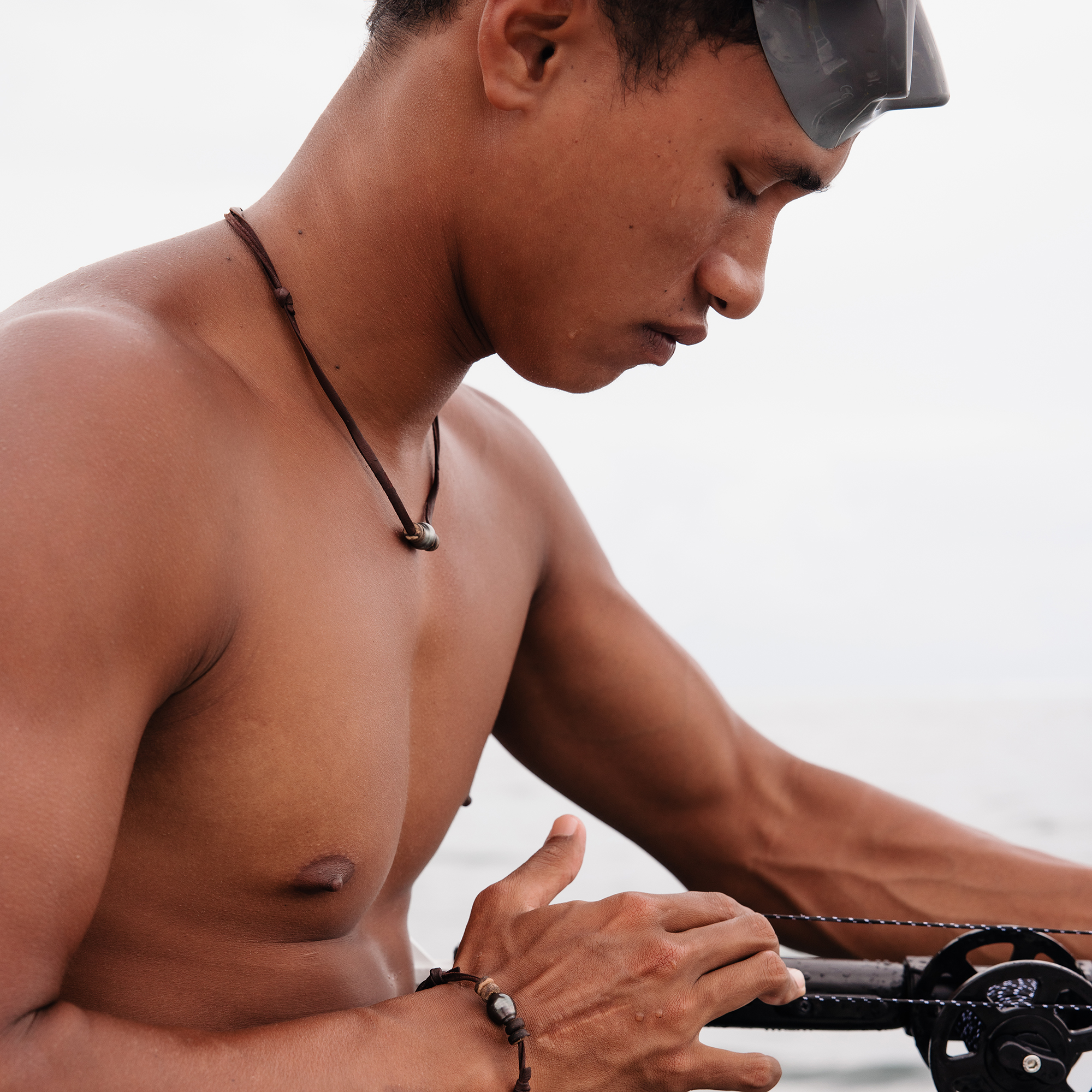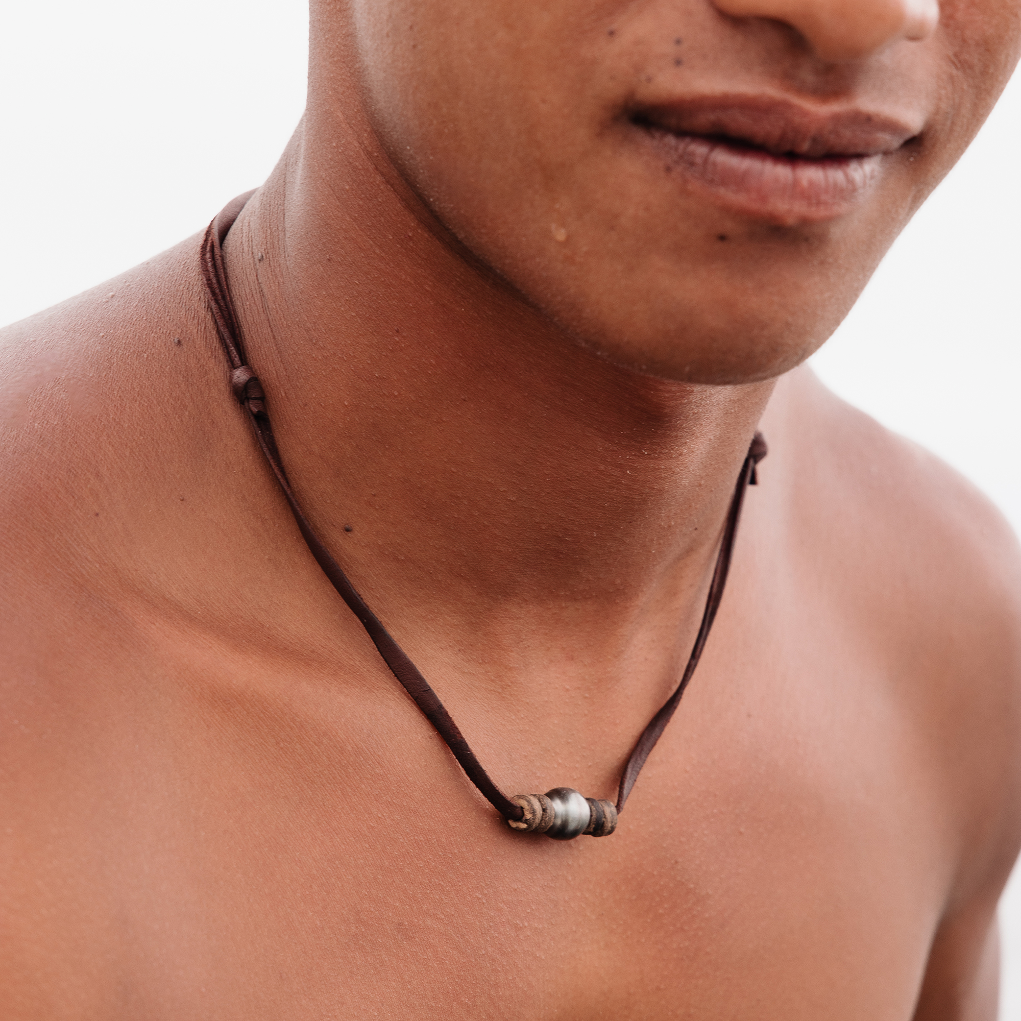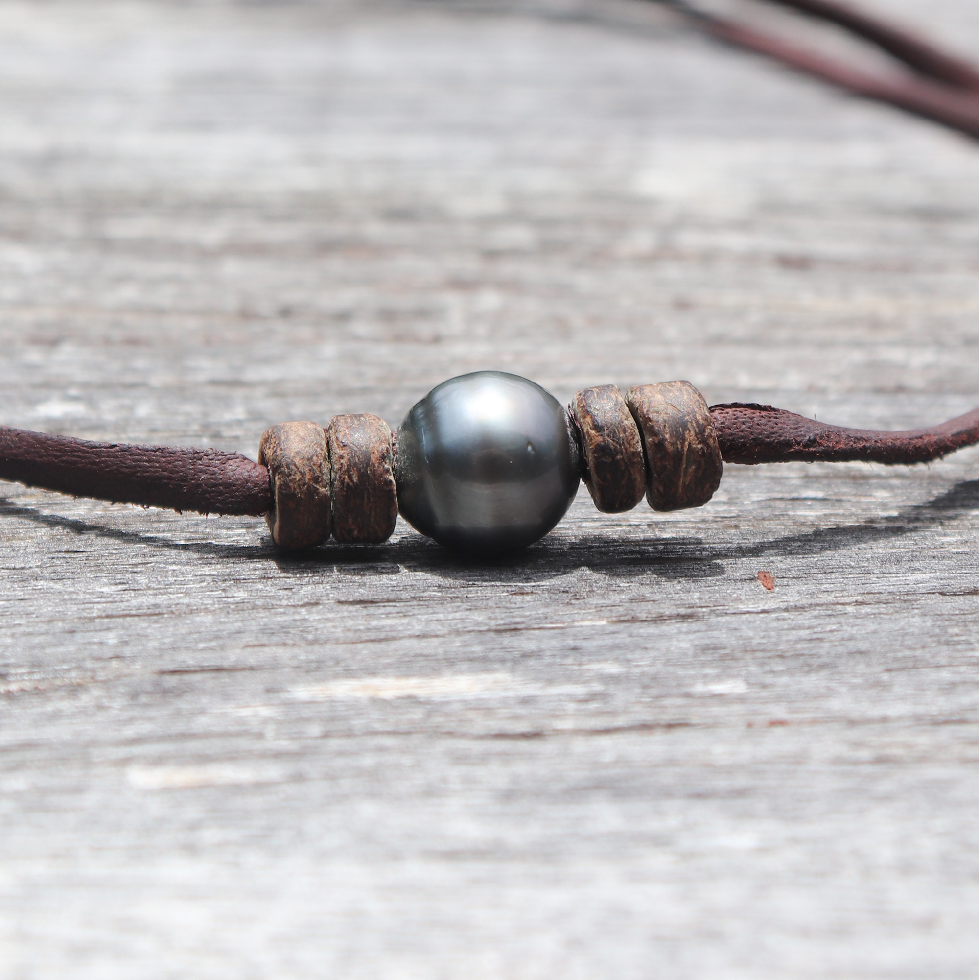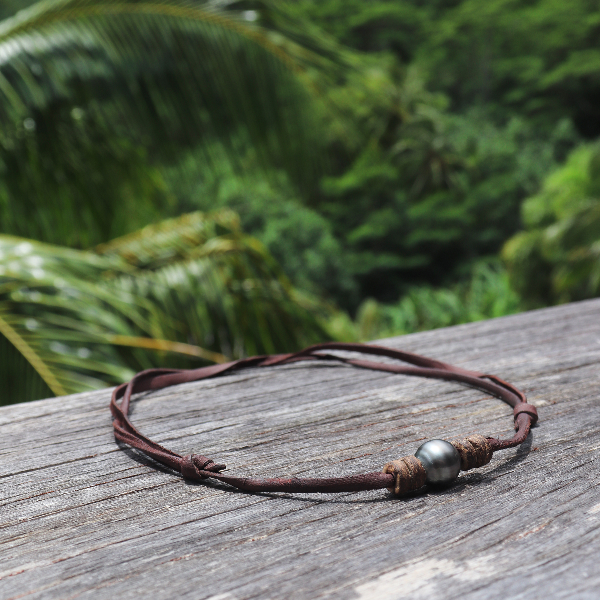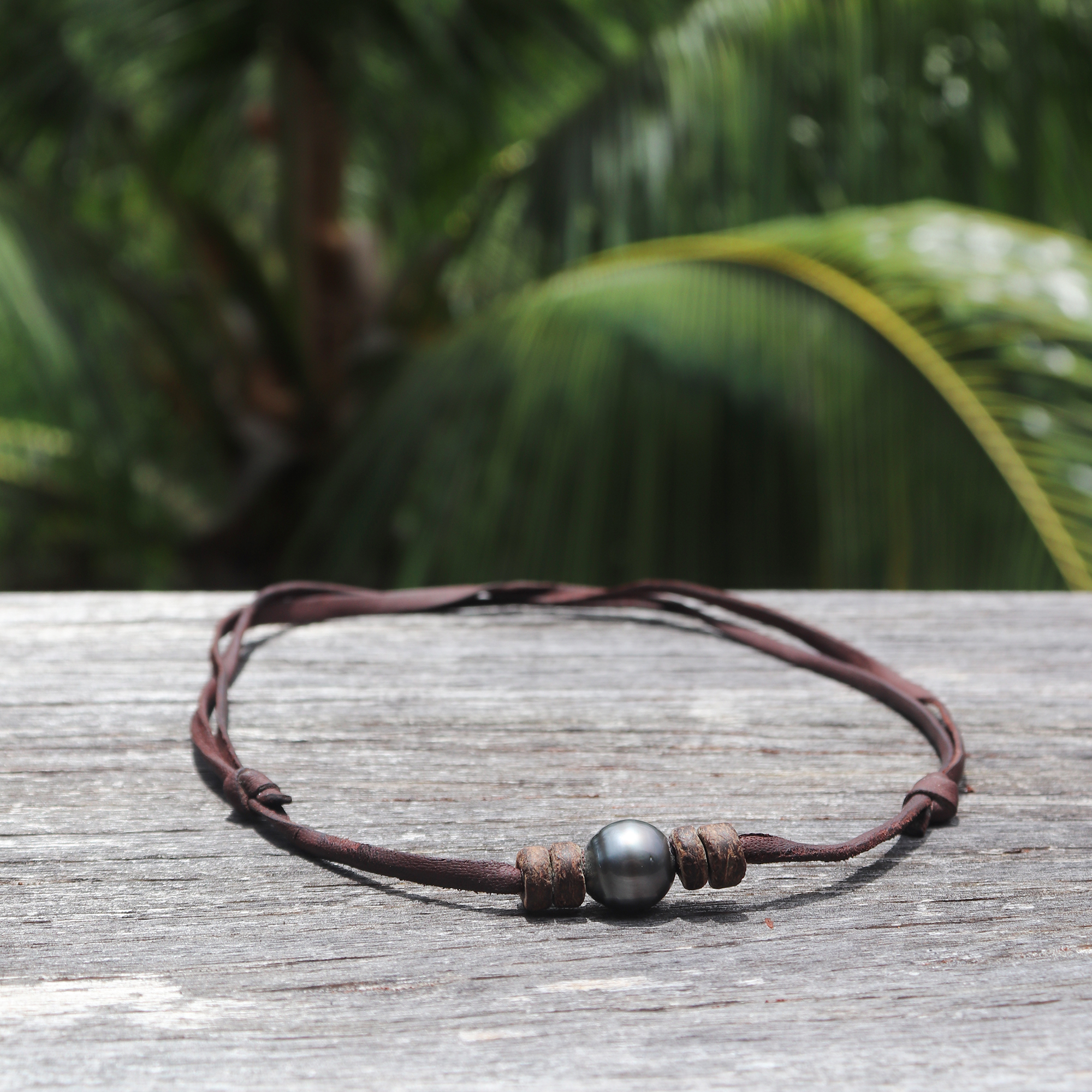 This necklace is composed of a beautiful Tahitian pearl surrounded by 4 small slices of coconut, and a leather cordon. Resistant and easy to manipulate, you can adjust it thanks to the running knots.