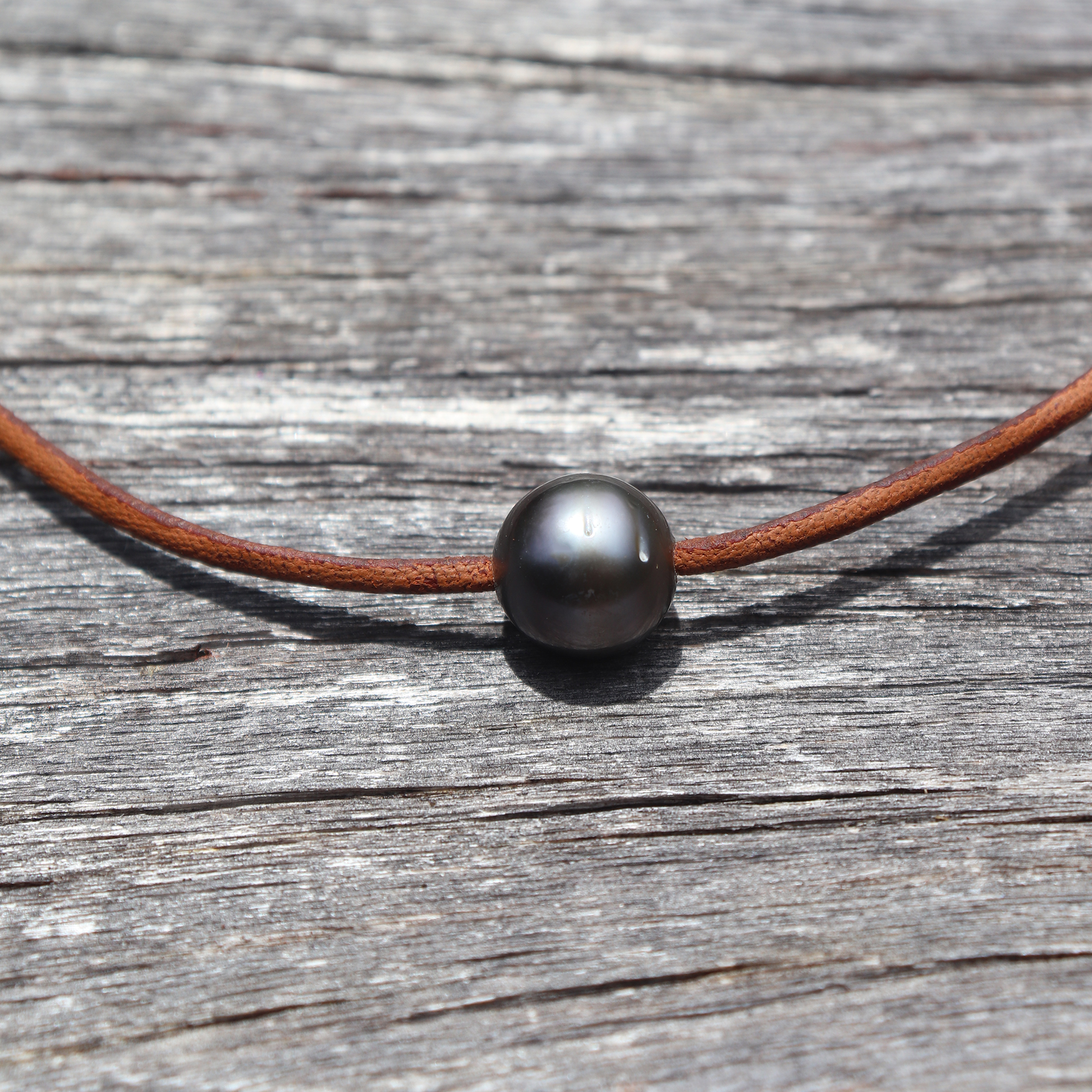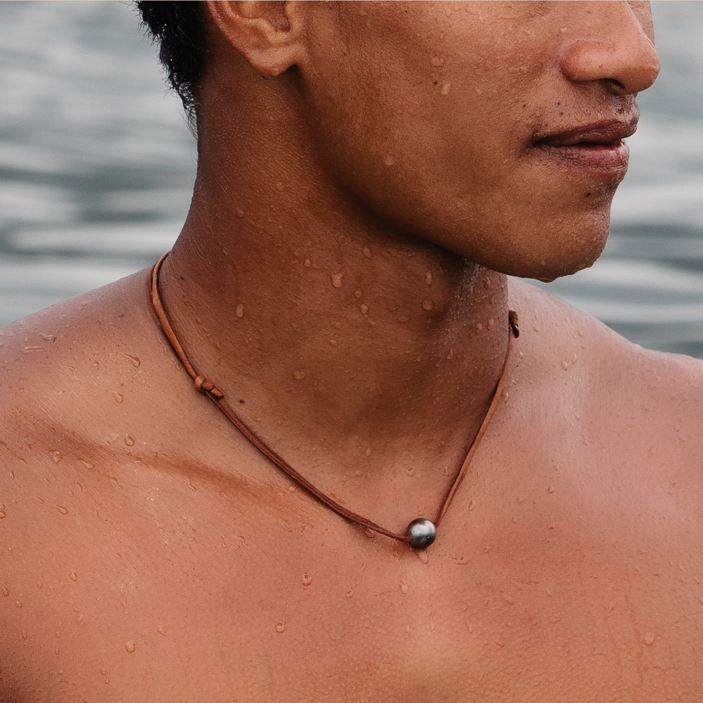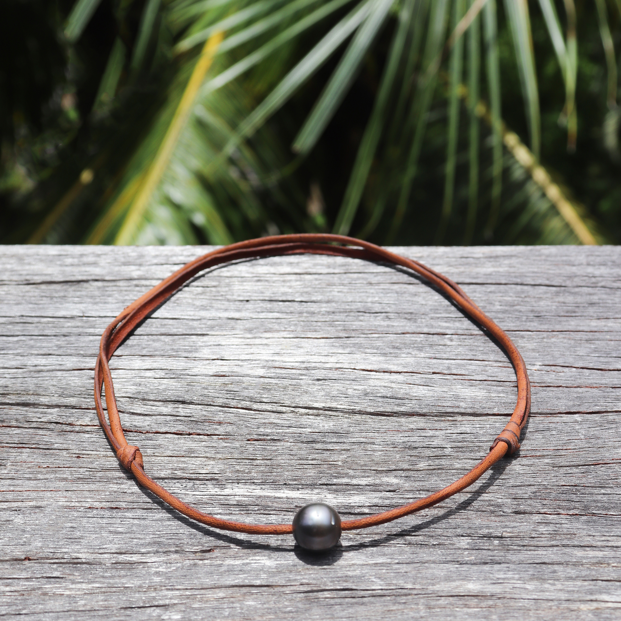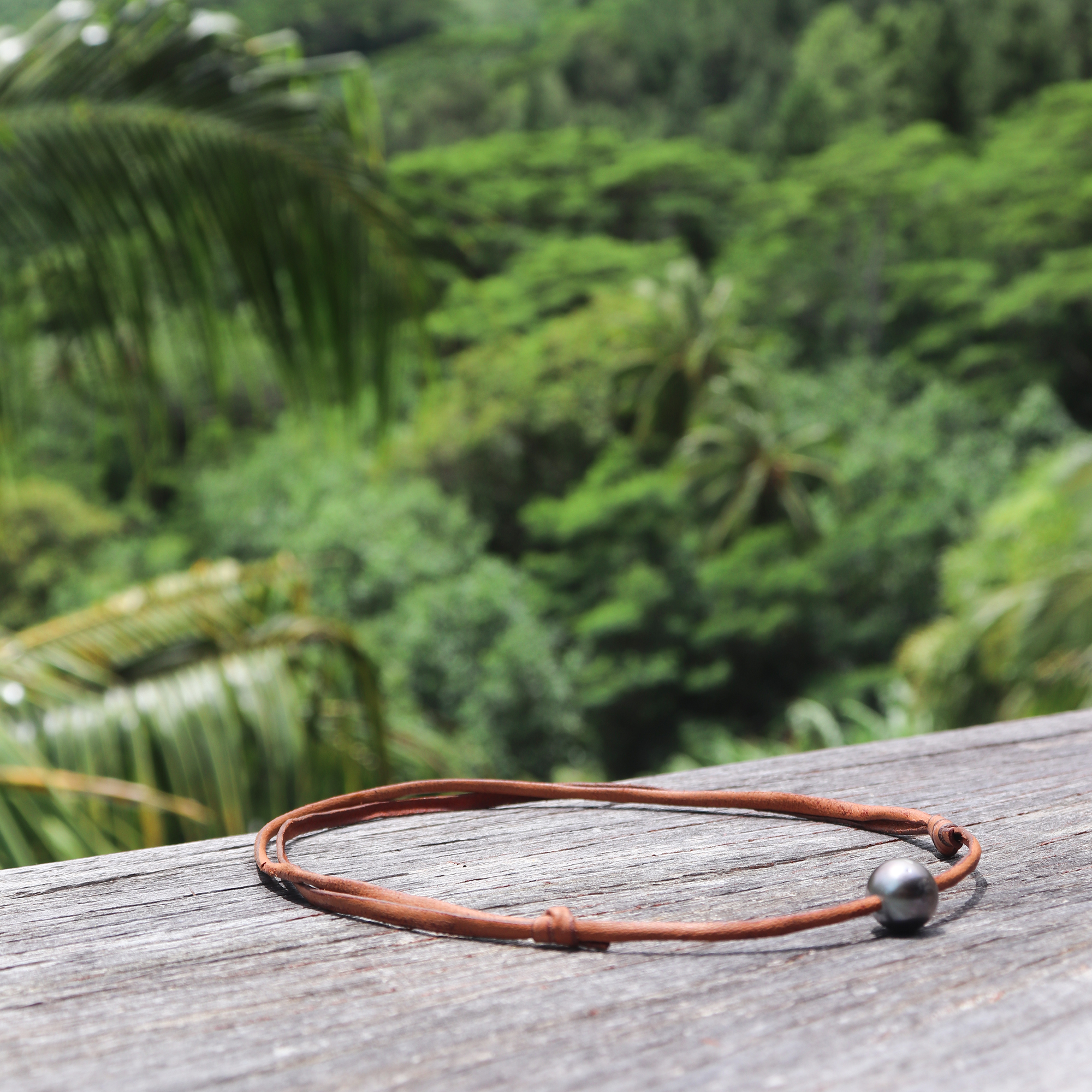 Le collier Motu se compose d’une belle perle de Tahiti montée sur un cordon en cuir. Résistant et facile à utiliser, il s’ajuste avec des noeuds coulissants.