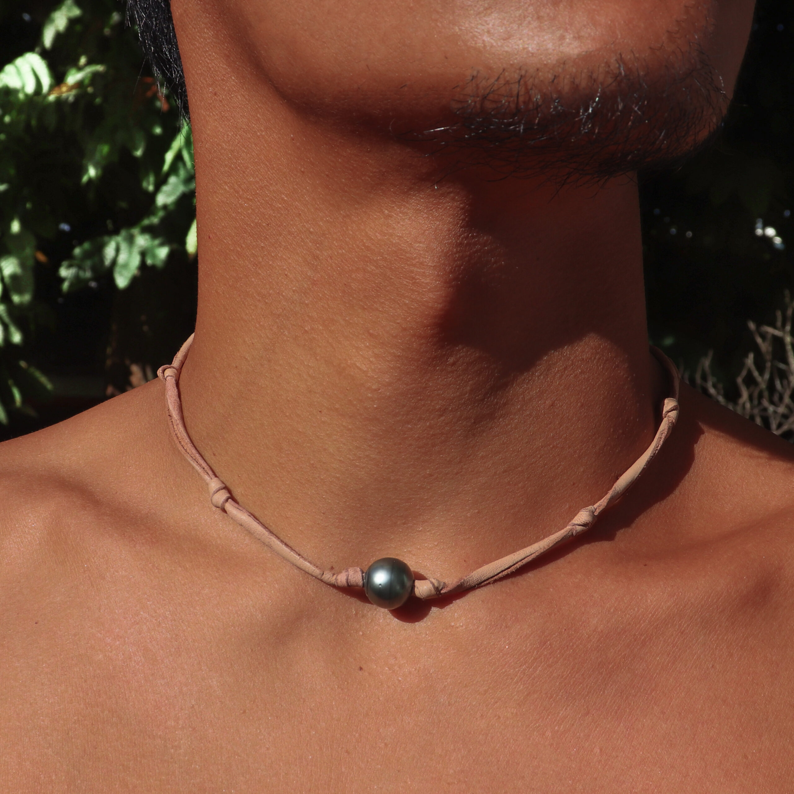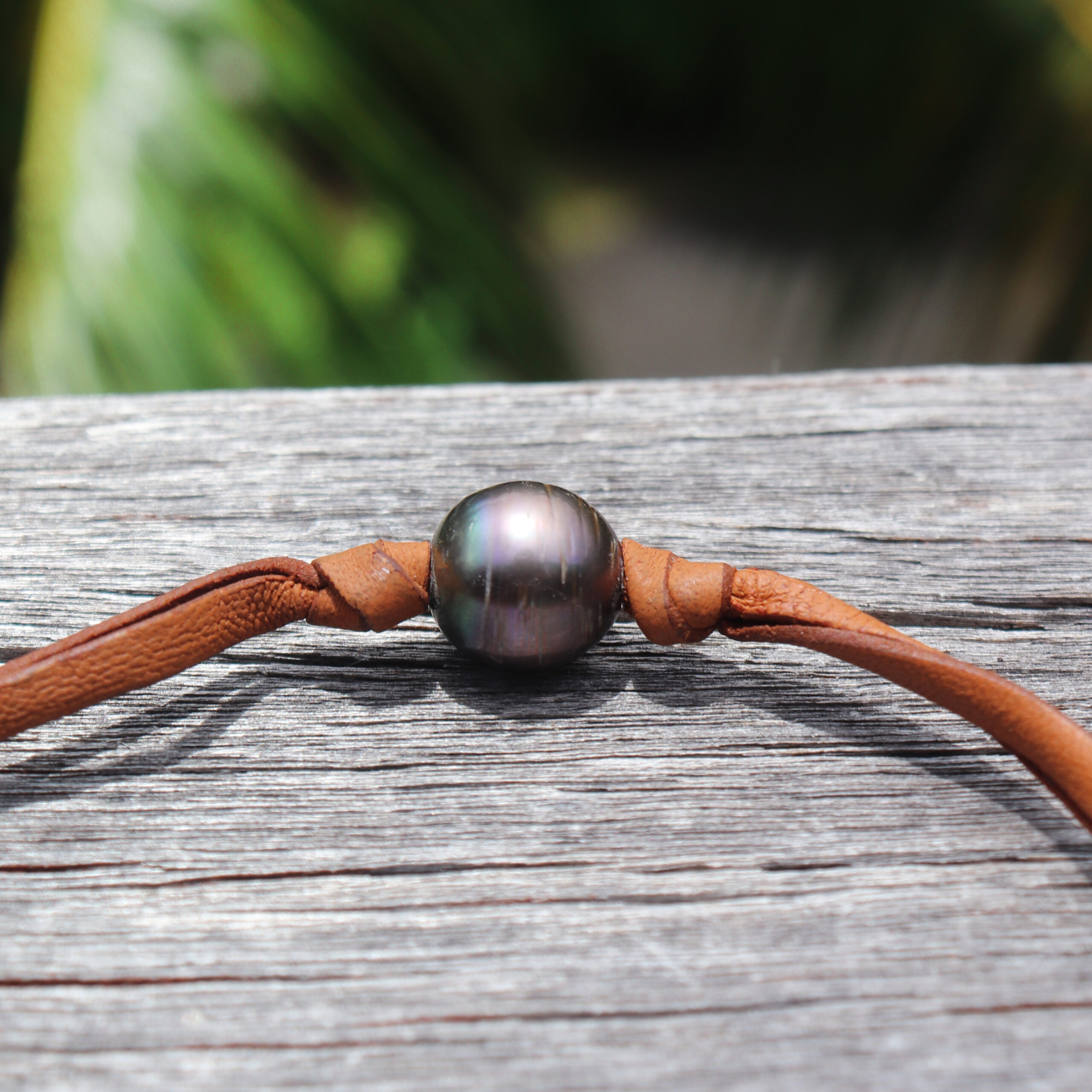 Le collier Poti se compose d’une belle perle de Tahiti montée sur du cuir doublé et noué. Vous pouvez choisir le système de fermeture, un fermoir perle, ou un fermoir mousqueton classique.