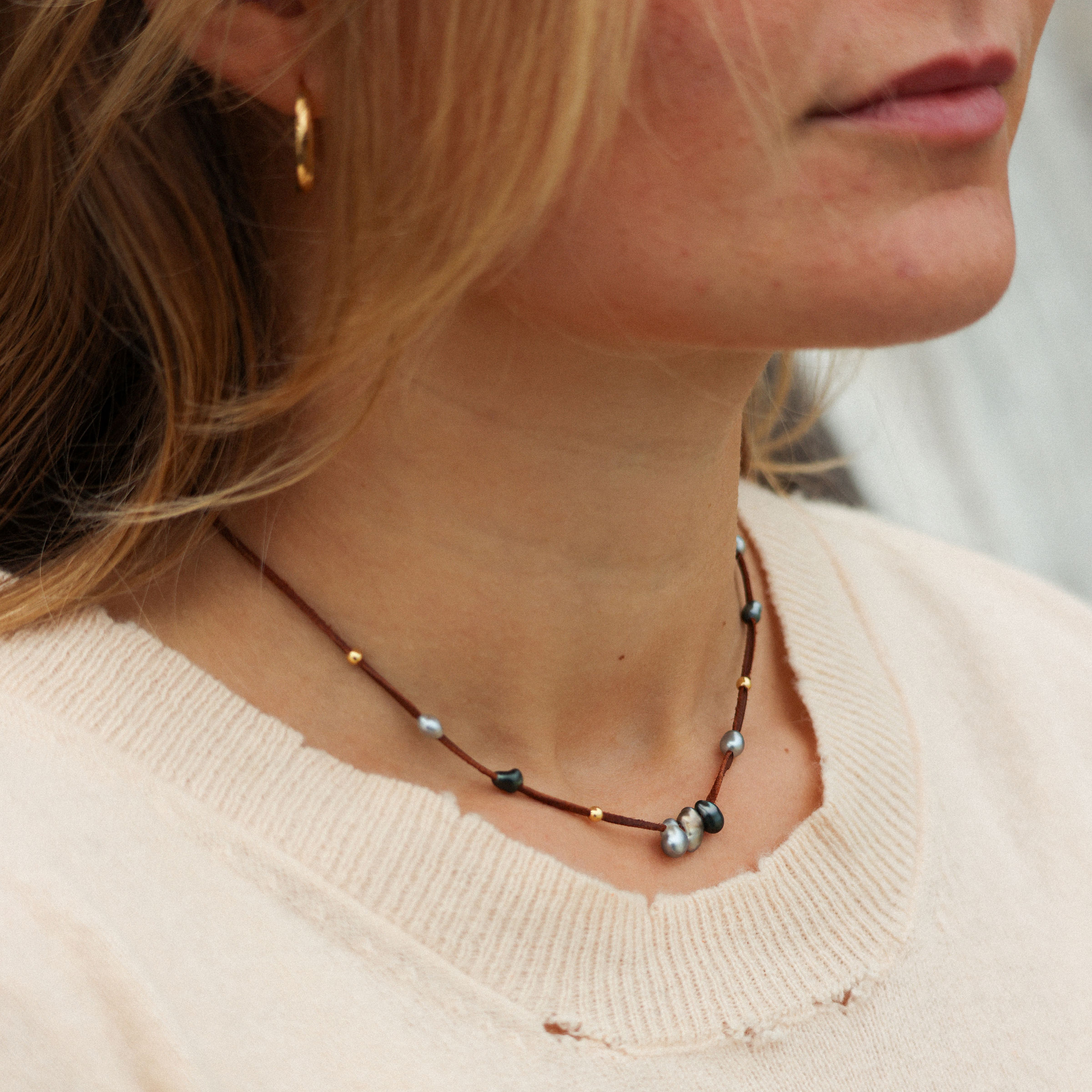 Collier fin en cuir avec des Keshis de Tahiti et des perles en GoldFilled. La taille des colliers est toujours réglable de quelques centimètres.